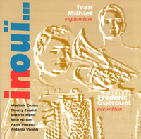 in oui... solo: Ivan Milhiet Accordeon: Frederic Guerouet Czardas (V.Monti) フランスでソロ活動を續けてゐるユーフォニアム奏者、I.ミリエ氏のソロアルバムです。V.コスマの「協奏曲」は、アコーディオンとのデュエットに書換へてのレコーディングですが、違和感が無く、ピアノ伴奏版よりも、しっくりと來ます。ミリエ氏の音色は非常にしっかりしてゐて、選曲もフランスの雰圍氣が充滿した、面白いCDです。 |