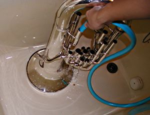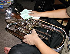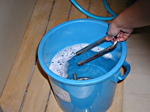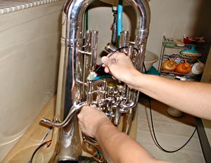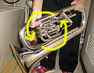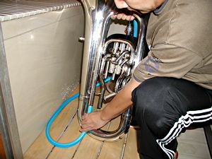 風呂桶が使へない場合、まづはベルに繋がってゐる管に、水道のホースを突っ込み、放水する。樂器が倒れないやうにしっかり持つこと。 大きい異物が中に入ってゐた場合、ベルの方から水を入れると詰まってしまふことがあるので、それを避けるためにも、管の方から入れた方が良い。 ベルの中7分目くらゐまで水が上ってきたら、一旦次の項目のやうに水を出す。その後、ベルの方から洗剤を溶いた水を入れ、次の項目とは逆の方向に回して、洗剤を行き渡らせるとよい。 |