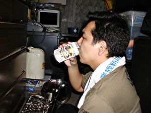 ここまでやったら、あとは樂器が乾くのを待つだけ。お茶でも飲んで、一息つこう。 未成年者の飲酒は法律で禁じられてをります。 |