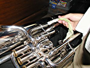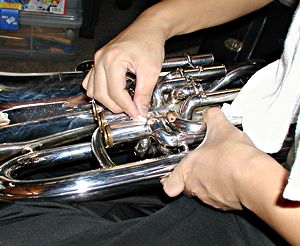 抜き差し管に、「スライドグリス」をよく伸ばして塗って、本體に装着。マウスパイプや抜き差し管の中に、ちょっとだけヴァルヴオイルを入れておくと、サビの防止になる。 ピストンの部品を組み立てて、ヴァルヴオイルをたっぷり付けて、本體に装着。この際、ピストンを入れる位置を間違へないやうにする。もし、ピストンが途中で引っかかって、カッチリ固まって動かなくなってしまったときは、自分では手を出さず、楽器屋さんに相談する。曲がってしまったら、さらに一大事になってしまふのだ。 スプリングをヴァルヴケーシングの下から入れ、ボトムキャップを閉める。この時、キャップのねじ部分にちょっとだけヴァルヴオイルを注すと、後で固まって外れなくなるのを防ぐことが出来る。ピストンを入れる前に装着しても良いが、スプリングが所定の位置にはまらないこともあるので、要注意。 洗った後は、水垢が表面に付着してゐるので、あまり綺麗には見えない。最後に上に擧げたやうな、それぞれの樂器に合ったポリッシュを使って全體を磨く。 さぁどうだ、これでピカピカだらう! |