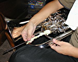 抜き差し管やピストンを組み立てる前に、細かい部分を磨いてしまはう。組み立てると、手の届かないところも、これでバッチリ。 なほ、ラッカーの樂器には「ラッカーポリッシュ」、銀メッキの樂器には「シルバーポリッシュ」、ノーラッカーの樂器には「メタルポリッシュ」が、ヤマハから發賣されてゐるので、必ず自分の樂器にあったものを使ふやうにしよう。違ふものを使ふと、表面を痛める恐れがある。 今回は、「BUZZ シルバークリーナー」といふのを使った。 |
