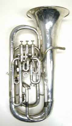 そこで、1800年代後期に「Euphonium」といふ名稱で、金管低音樂器を製造してゐるメーカーはないかと探してみた。すると、A.ベインズの「金管楽器とその歴史」(音楽之友社刊)に、1849年頃の Henry Distin 社(イギリス)の廣告が掲載されてをり、そこに「Euphonium」なる樂器が掲載されてゐた。