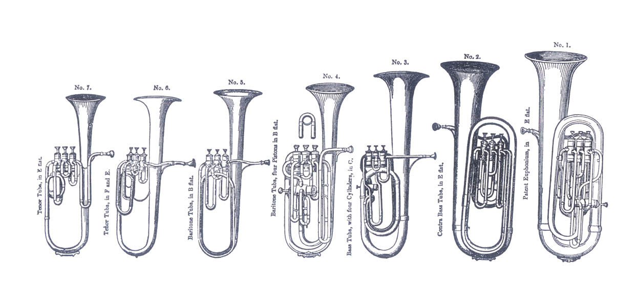 向かって右端が「Euphonium」である。クリックして拡大畫像を見て頂きたいのだが、この樂器は、その隣の「Contra Bass Tuba in E flat」のボアを、さらに拡大したやうなモデルに見える。さう、B♭管ではなく、なんとE♭管なのである。ベインズの注によれば、Distin 社の「Tuba」は、ベルアップ型のサクソルンを指すといふことだ。從って、Distin 社における「Euphonium」は、「Saxhorn Contrabasse en Mi♭」のボアを拡大したものであったといふことになる。