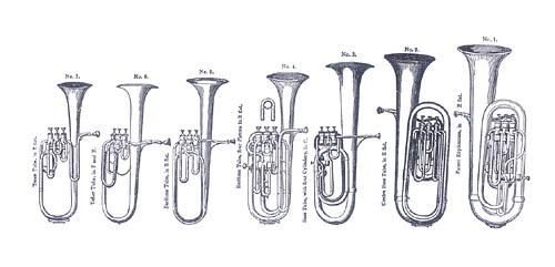 | 現行 | 1921年頃 | 下の繪は1874〜1878年頃のユーフォニアムであるかのやうな引用がよくされるのだが、實はいつの頃のモデルであるかが定かではない。 |