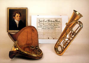 話は少々ずれ込むが、ロータリー系のバリトンやテノールホルンが、ユーフォニアムとは別の樂器であるとして、我國で「テナーテューバ」と呼ばれてゐることに對して、筆者はこれまで異を唱へて來た。「テナーテューバといふのは、パート名であり、樂器名ではない」と。確かに、モリッツの時代にテノールテューバといふ樂器は作られてゐた。しかし、モリッツがテノールテューバといふ名の樂器を作ったといふことを歴史的背景として、現代のロータリー系のバリトンやテノールホルンを「テナーテューバ」と呼ぶのは、やはりをかしい。日本で「テナーテューバ」と呼ばれてしまってゐるロータリー系の樂器と、ヴィープレヒトがモリッツに作らせたテノールテューバとは、ご覧になれば判る通り、相當に違ふものであることがお判りになるであらう。