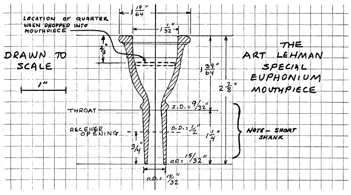 1960年代アメリカ海兵隊のユーフォニアムの名手である、アーサー・レーマン氏(知らない人は「徒然草」>演奏者の「顏」を參照)が特注したマウスピースの復刻モデル(Dave Houser 製)を入手した。氏の「The Art of Euphonium Playing Volume 2」に、その設計圖が載ってゐる。とにかく深いVカップ、肉が薄く輕い、そしてシャンクが短いところに特徴がある。